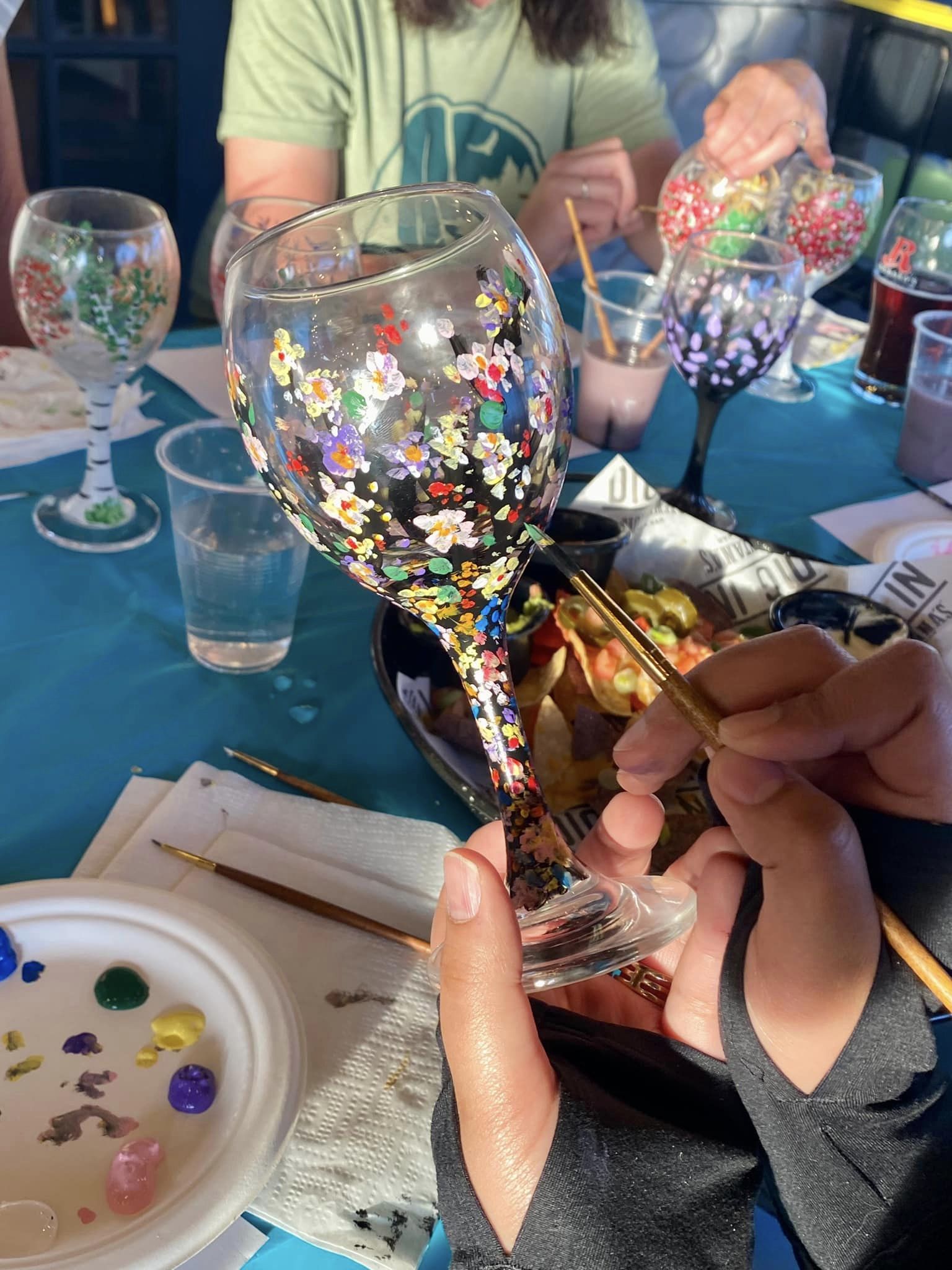 - You’ll spend approx. two hours painting on 2 wine glasses each.